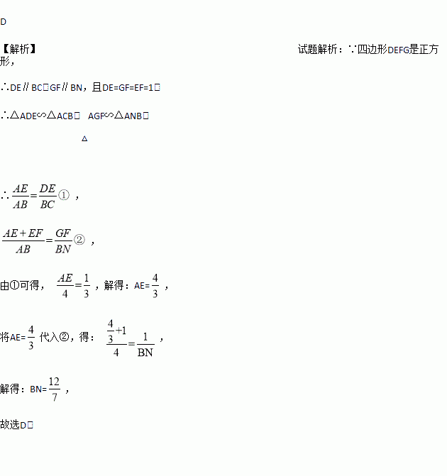 如图的△ABC中有一正方形DEFG,其中D在AC上,E、F在AB上,直线AG分别交DE、BC于M、N两点.若∠B=90°,AB=4,BC=3,EF=1,则BN的长度为何?( )