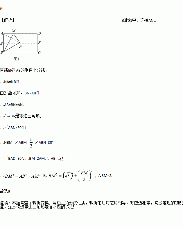 如图,对折矩形纸片ABCD,使AD与BC重合,得到折痕EF,把纸片展开.再一次折叠纸片,使点A落在EF上,得到折痕BM,同时,得到线段BN,若