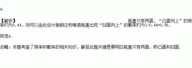 抛掷同一枚啤酒瓶盖1000次,经过统计得“凸面向上”的频率约为0.44,则由此可估计抛掷这枚啤酒瓶盖出现“凹面向上”的概率约为( )