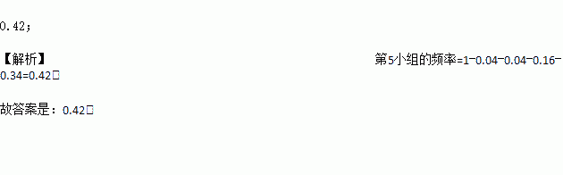 某班把学生分成5个学习小组,前 4个小组的频率分别是0.04、0.04、0.16、0.34,第三个小组的频数是8,则第5小组的频率是________。