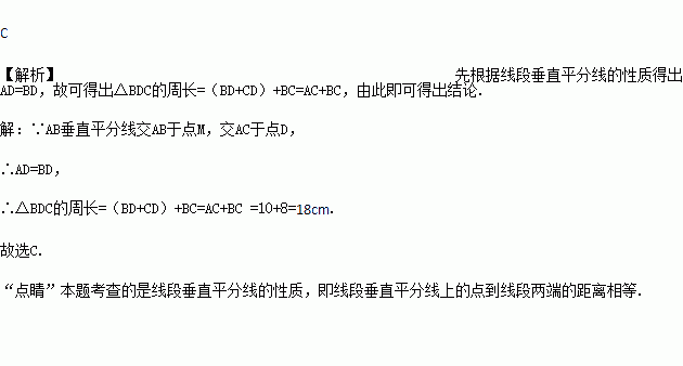 如图,在△ABC中,AC=10,BC=8,AB垂直平分线交AB于点M,交AC于点D,则△BDC的周长为( )