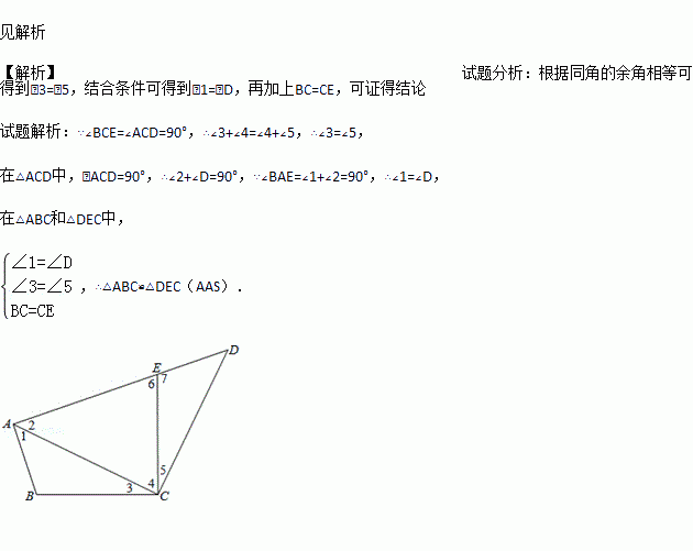 如图,∠A=∠B=90°,E是AB上的一点,且AE=BC,∠1=∠2.