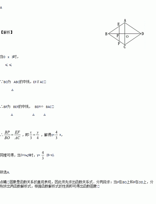 如图,在菱形ABCD中,AC=4,BD=6,P是BD上的任意一点,过点P作EF∥AC,与菱形的两条边分别交于点E、F. 设BP =x,EF =y,则下列图象能大致反映y与x的函数关系的是( )
