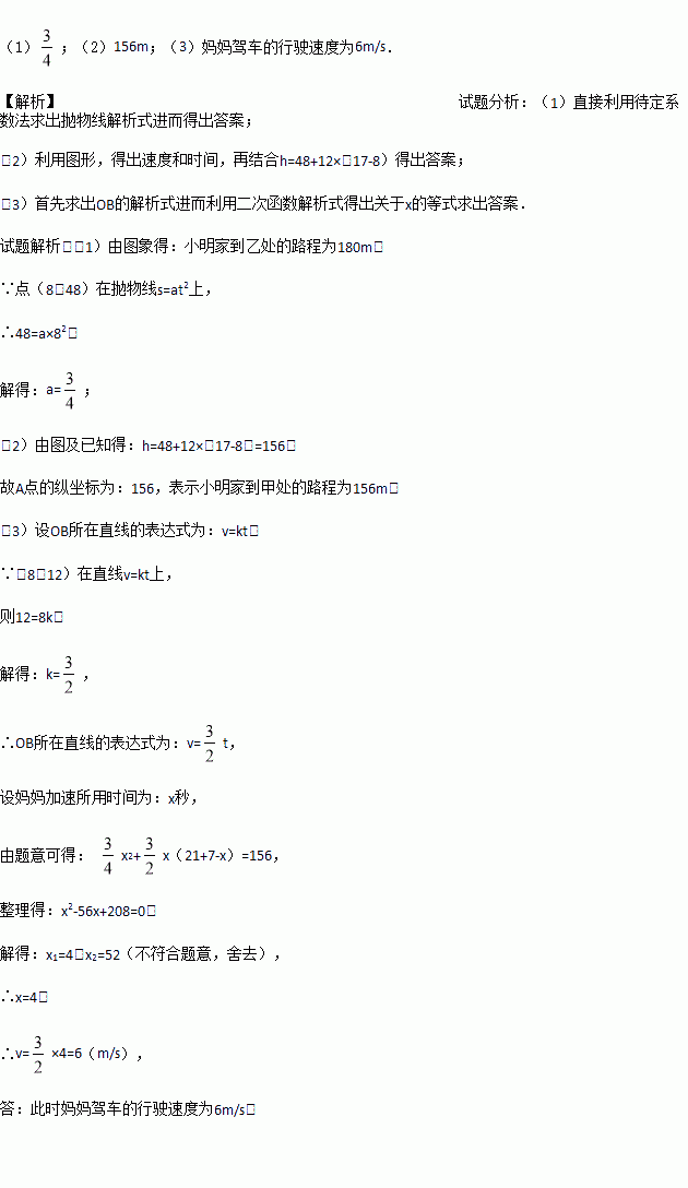 与时间t(s)的关系也满足s=at2,当她行驶到甲处时,前方的绿灯刚好亮起,求此时妈妈驾车的行驶速度.
