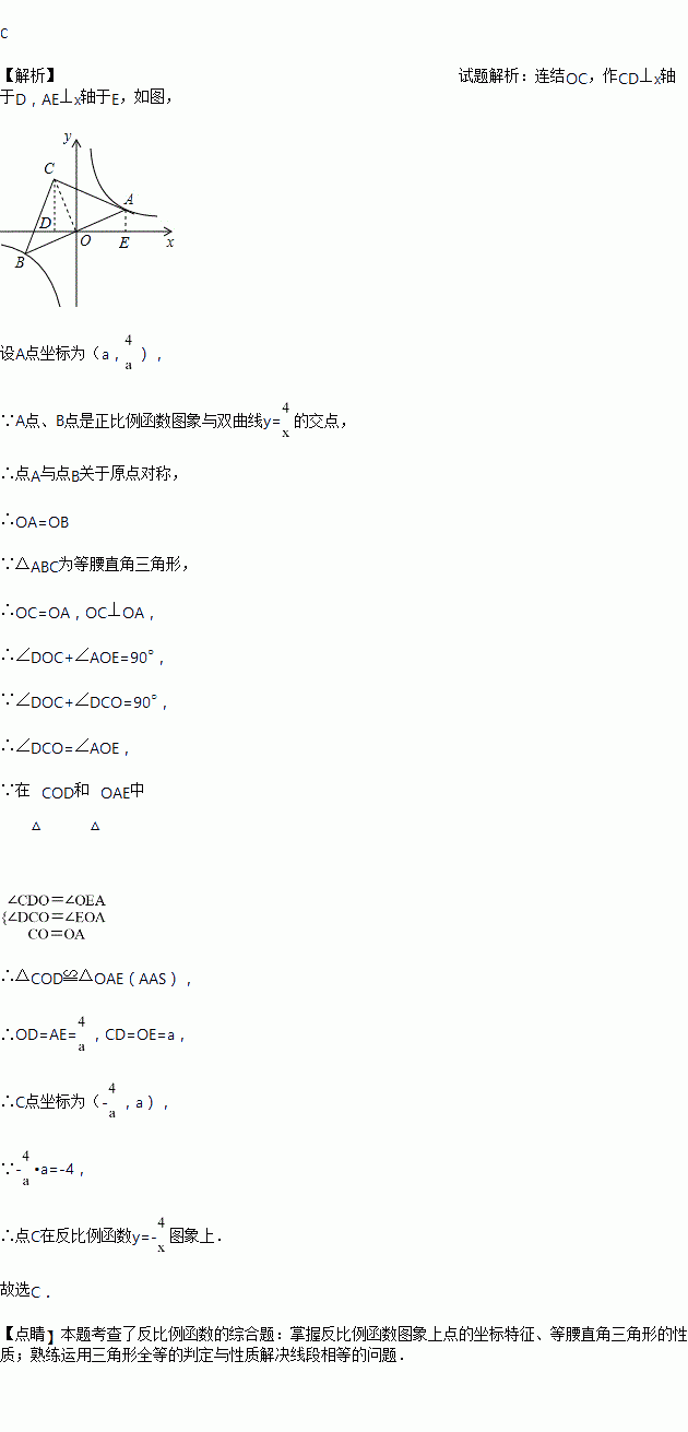 在第一象限上的一动点,连接AO并延长交另一分支于点B,以AB为斜边作等腰Rt△ABC,点C在第二象限,随着点A的运动,点C的位置也不断的变化,但始终在一函数图象上运动,则这个函数的解析式为( )
