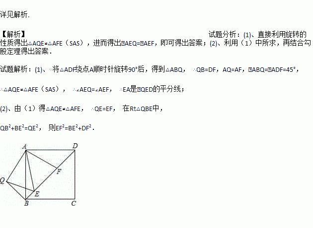 如图,在正方形ABCD中,E、F是对角线BD上两点,且∠EAF=45°,将△ADF绕点A顺时针旋转90°后,得到△ABQ,连接EQ,求证: