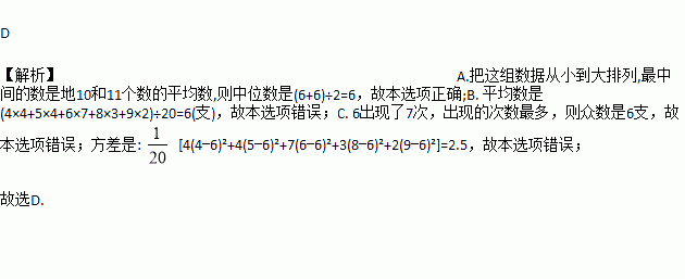 A. 中位数是6支 B. 平均数是6支 C. 众数是6支 D. 方差是5
