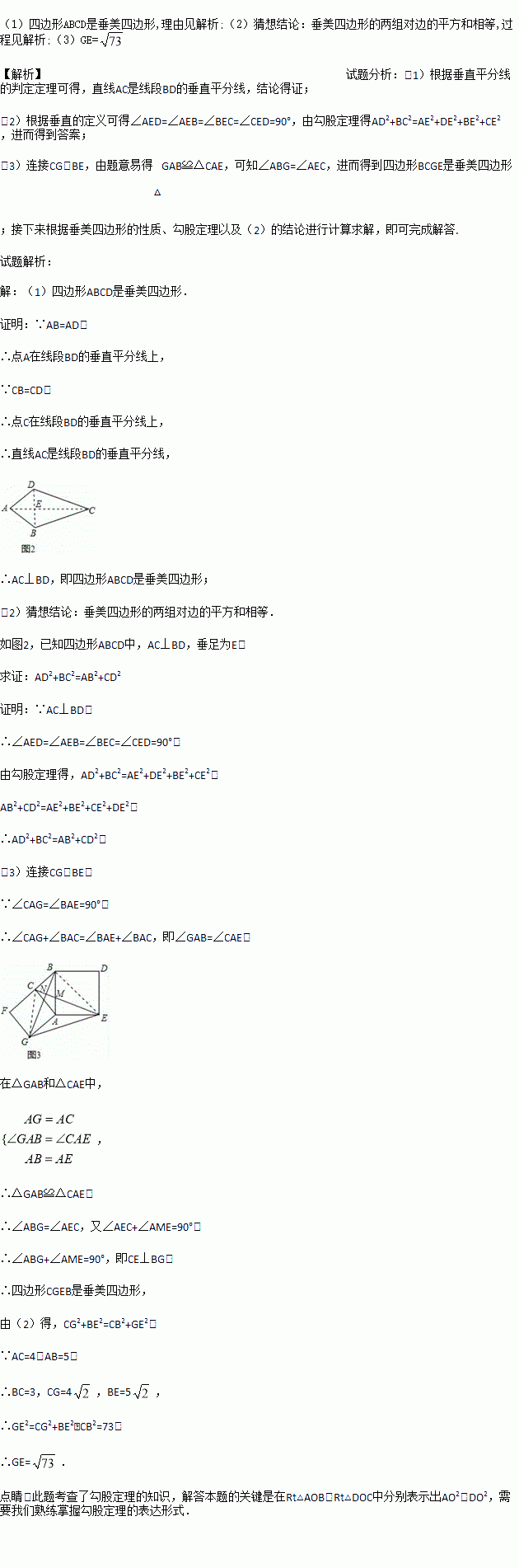 (3)ÎÊÌâ½â¾ö£ºÈçͼ3£¬·Ö±ðÒÔRt¡÷ACBµÄÖ±½Ç±ßACºÍб±ßABΪ±ßÏòÍâ×÷Õý·½ÐÎACFGºÍÕý·½ÐÎABDE£¬Á¬½ÓCE£¬BG£¬GE£¬ÒÑÖªAC=4£¬AB=5,ÇóGE³¤£®