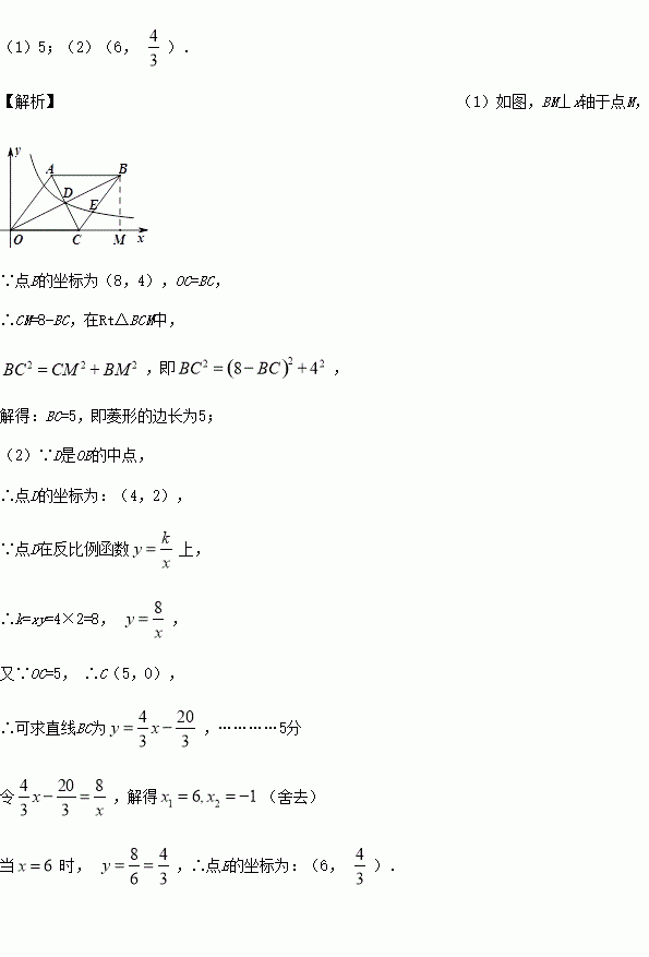 如图,菱形OABC的边OC在x轴正半轴上,点B的坐标为(8,4).