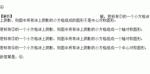 如图是3×4正方形网格,其中已有5各小方格涂上阴影,若再选取标有①,②,③,④中的一个小方格涂上阴影,使图中所有涂上阴影的小方格组成一个中心对称图形,则该小方格是_____.(填序号)