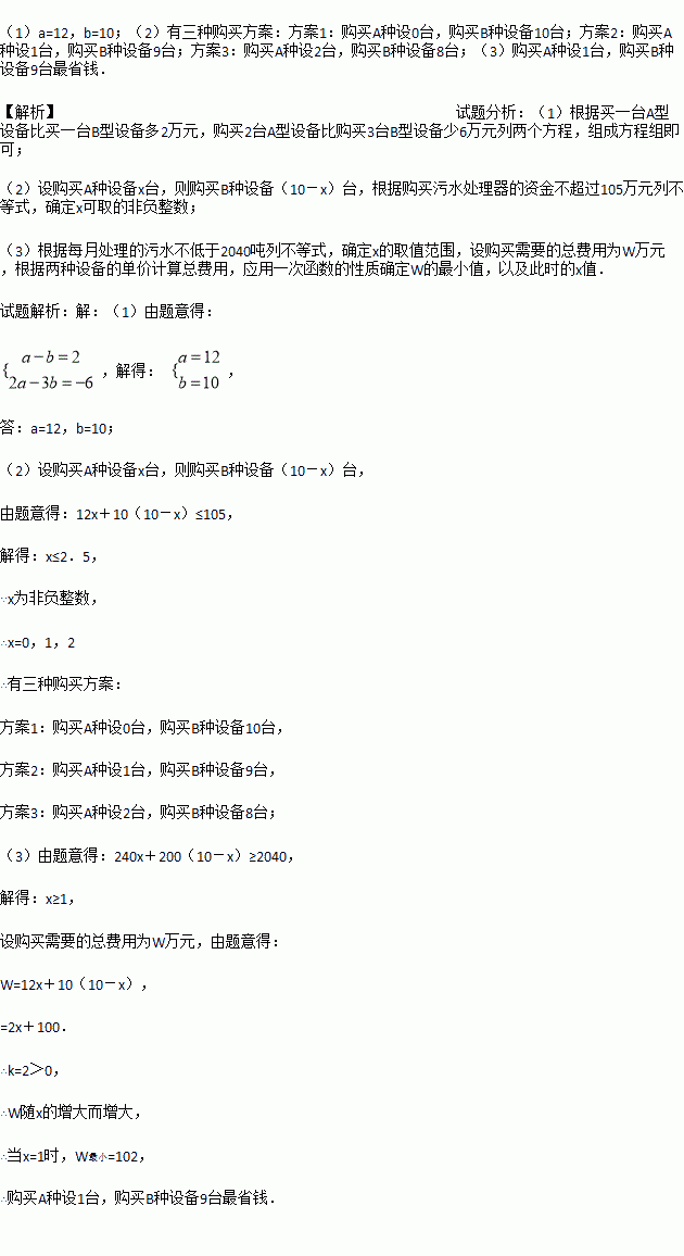 为了更好地治理小凌河水质,保护环境,市治污公司决定购买10台污水处理设备,现有A 、B两种设备,A 、B单价分别为a万元/台、 b万元/台,月处理污水分别为240吨/月、200吨/月,经调查,买一台A型设备比买一台B型设备多2万元,购买2台A型设备比购买3台B型设备少6万元.