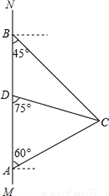 +1)海里,船C在船A的北偏东60°方向上,船C在船B的东南方向上,MN上有一观测点D,测得船C正好在观测点D的南偏东75°方向上.