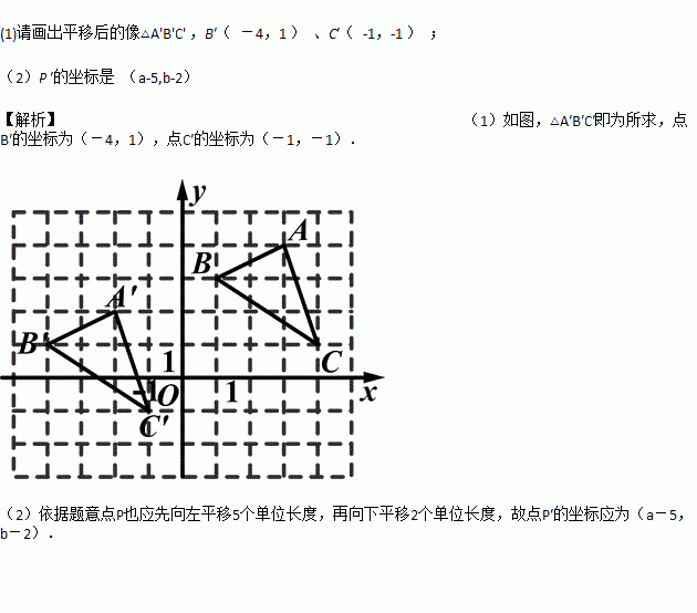 (1)请画出平移后的像△A'B'C'(不写画法) ,并直接写出点B′、C′的坐标: