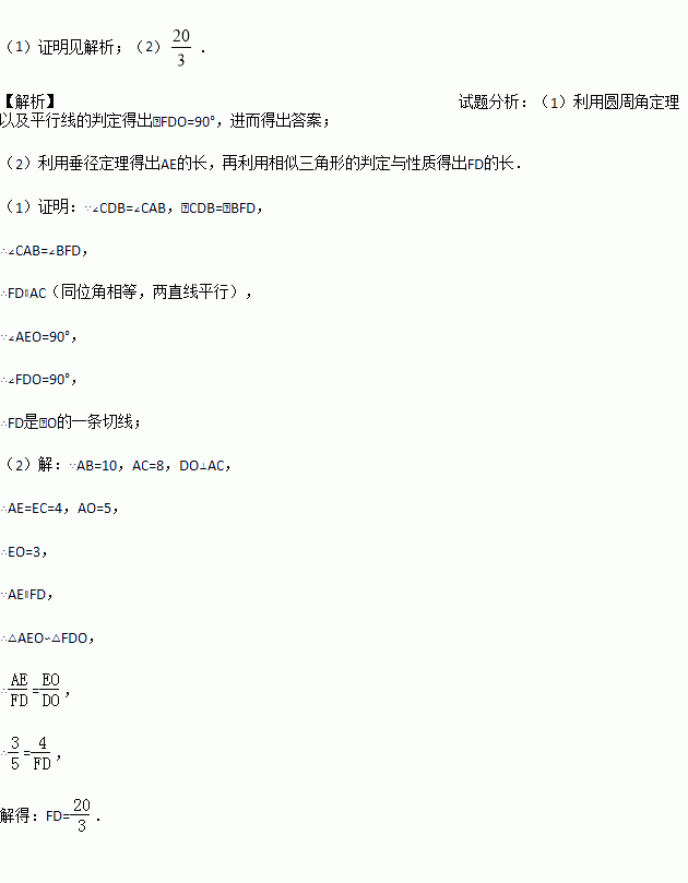 如图,AB是⊙O的直径,OD垂直于弦AC于点E,且交⊙O于点D,F是BA延长线上一点,若∠CDB=∠BFD.