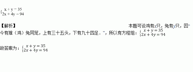 《孙子算经》是中国重要的古代数学著作.书中记载了有趣的“鸡兔同笼”问题:“今有雉兔同笼,上有三十五头,下有九十四足,问雉兔各几何?”这句话的意思是:“有若干只鸡兔同在一个笼子里,从上面数,有35个头;从下面数,有94只脚.求笼中各有几只鸡和兔?”设有鸡x只,兔y只,可列方程组为______.