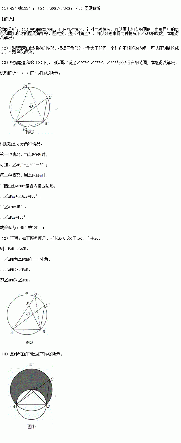 (1)若∠ACB=45°,点P是⊙O上一点(不与A、B重合),则∠APB= ;