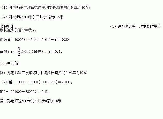 £¨2£©ËïÀÏʦ·¢ÏÖºÃÓÑÖв½ÊýÅÅÃûµÚһΪ24000²½£¬Òò´ËÔÚÁ½´Î¶ÍÁ¶½áÊøºóÓÖ×ßÁË500Ã×£¬Ê¹µÃ×ܲ½ÊýÇ¡ºÃΪ24000²½£¬ÇóËïÀÏʦÕâ500Ã׵į½¾ù²½³¤£®