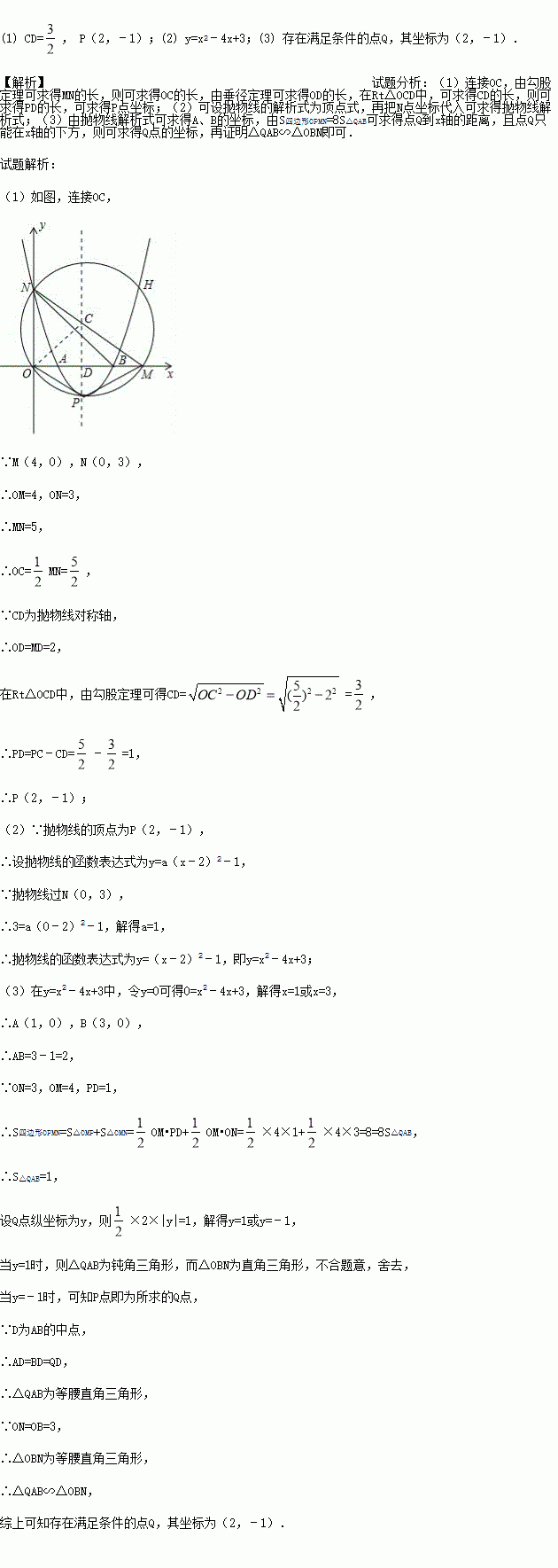 如图所示,在平面直角坐标系中,⊙C经过坐标原点O,且与x轴,y轴分别相交于M(4,0),N(0,3)两点.已知抛物线开口向上,与⊙C交于N,H,P三点,P为抛物线的顶点,抛物线的对称轴经过点C且垂直x轴于点D.