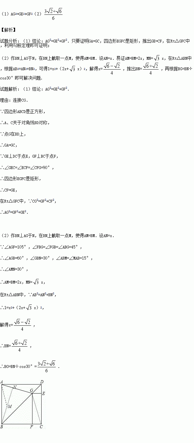 (2)若正方形ABCD的边长为1,∠AGF=105°,求线段BG的长.