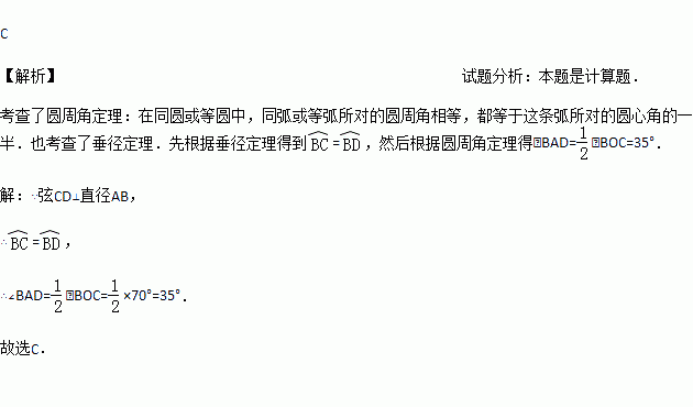 如图,线段AB是圆O的直径,弦CD⊥AB,如果∠BOC=70°,那么∠BAD等于( )