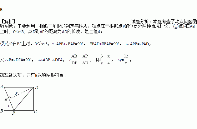 如图,矩形ABCD中,AB=3,BC=4,点P从A点出发,按A→B→C的方向在AB和BC上移动.记PA=x,点D到直线PA的距离为y,则y关于x的函数关系的大致图像是( )