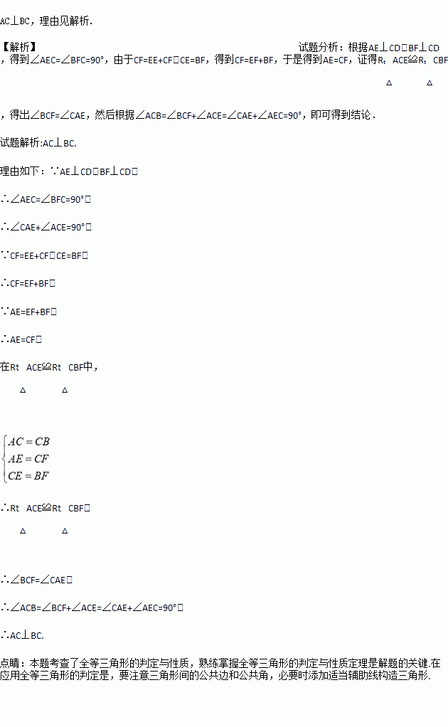 如图:在△ABC中,AC=BC,D是AB上的一点,AE⊥CD于点E,BF⊥CD于点F,若CE=BF,AE=EF+BF.试判断AC与BC的位置关系,并说明理由.