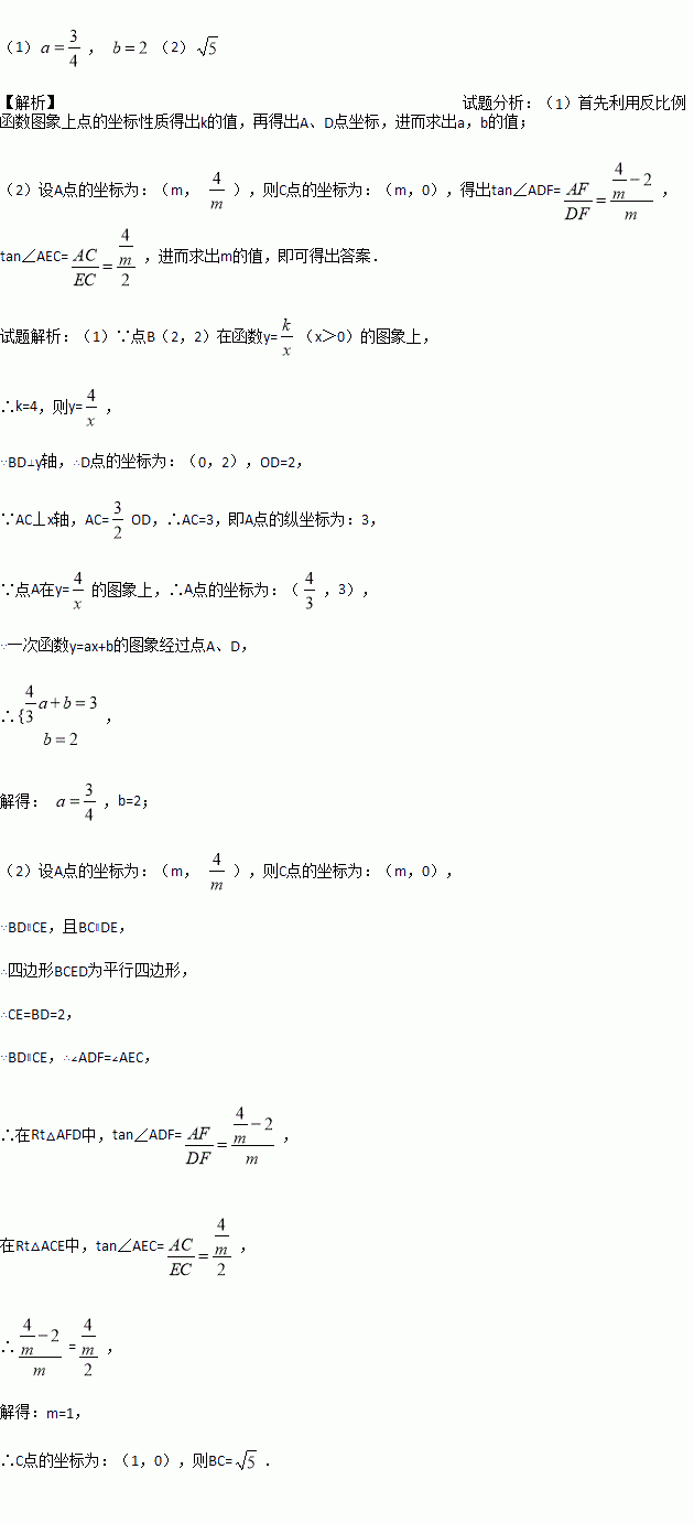 (x>0)的图象经过点A、B,点B的坐标为(2,2).过点A作AC⊥x轴,垂足为C,过点B作BD⊥y轴,垂足为D,AC与BD交于点F.一次函数y=ax+b的图象经过点A、D,与x轴的负半轴交于点E