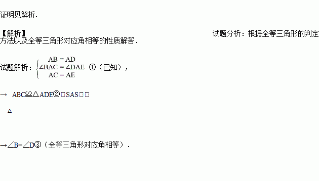 如图,AB=AD,AC=AE,∠BAC=∠DAE,∠B与∠D相等吗?