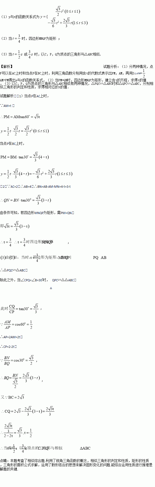 (3)t为何值时,以C,P,Q为顶点的三角形与△ABC相似?