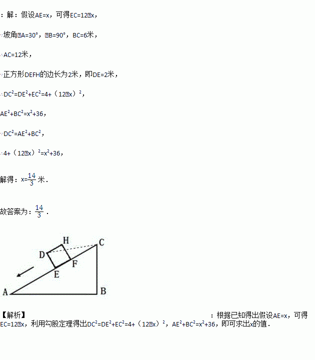 (2011•綦江县)一个正方体物体沿斜坡向下滑动,其截面如图所示.正方形DEFH的边长为2米,坡角∠A=30°,∠B=90°,BC=6米.当正方形DEFH运动到什么位置,即当AE=