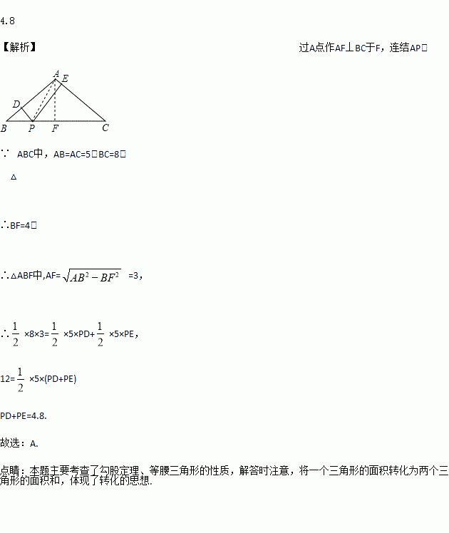 △ABC中,AB=AC=5,BC=8,点P是BC边上的动点,过点P作PD⊥AB于点D,PE⊥AC于点E,则PD+PE的长是________.