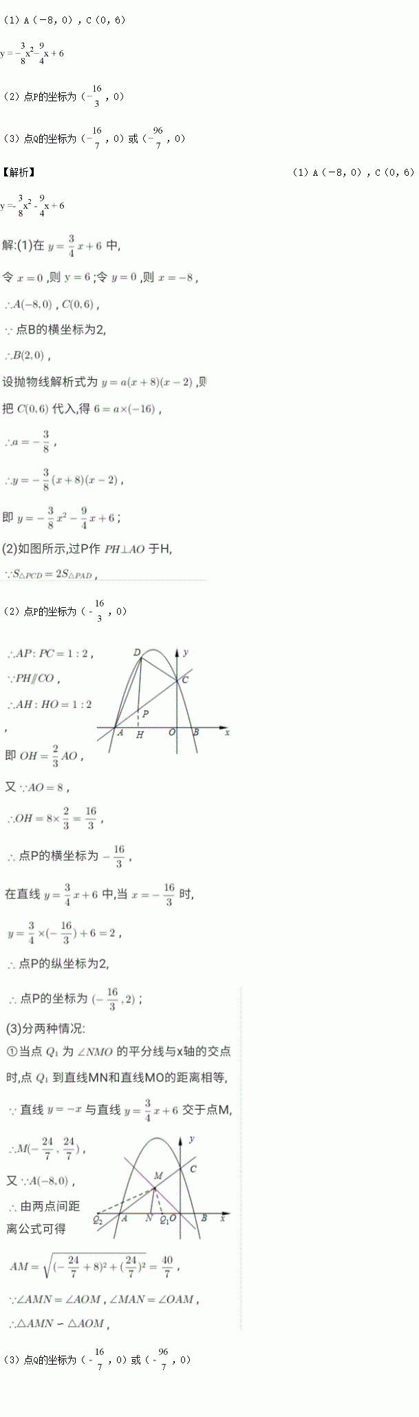 (3)如图2,另有一条直线y=-x与直线AC交于点M,N为线段OA上一点,∠AMN=∠AOM.点Q为x轴负半轴上一点,且点Q到直线MN和直线MO的距离相等,求点Q的坐标.