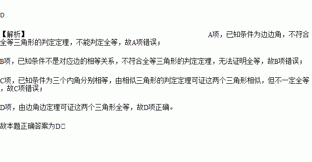 C. ∠B=∠E,∠A=∠D,∠C=∠F D. AB=DE, BC=EF, ∠B=∠E