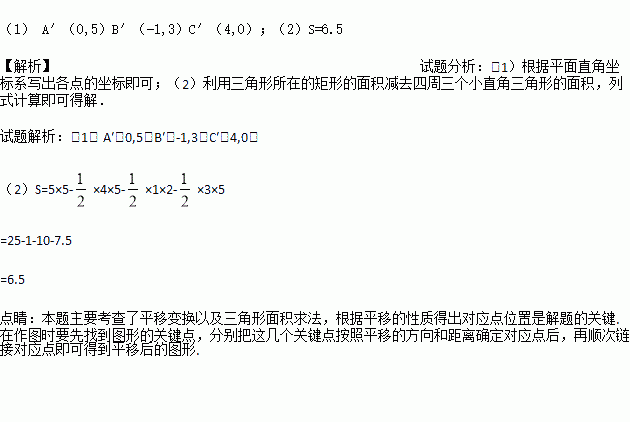 在平面直角坐标系中, 三角形ABC三个顶点的位置如图(每个小正方形的边长均为1).把三角形ABC沿x轴向右平移3个单位长度,再沿y轴向上平移2个单位长度后得到三角形A′B′C′(其中A′、B′、C′分别是A、B、C的对应点.)