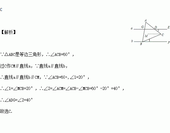 如图,直线a∥b,等边三角形ABC的顶点B在直线b上,∠CBF=20°,则∠ADG度数为( )
