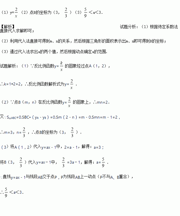 如图,在平面直角坐标系中,反比例函数y=kx-1(x>0)的图象经过点A(1,2)和点B(m,n)(m>1),过点B作y轴的垂线,垂足为C.