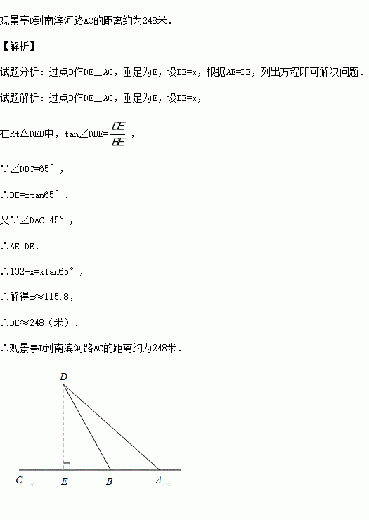 ÃÀÀöµÄ»ÆºÓÍðÈçÒ»ÌõÓñ´ø´©³Ç¶ø¹ý£¬ÑغÓÁ½°¶µÄ±õºÓ··çÇéÏßÊÇÀ¼ÖÝ×îÃÀµÄ¾°¹ÛÖ®Ò»£®Êýѧ¿ÎÍâʵ¼ù»î¶¯ÖУ¬Ð¡ÁÖÔÚÄϱõºÓ·ÉϵÄA£¬BÁ½µã´¦£¬ÀûÓòâ½ÇÒÇ·Ö±ð¶Ô±±°¶µÄÒ»¹Û¾°Í¤D½øÐÐÁ˲âÁ¿£®Èçͼ£¬²âµÃ¡ÏDAC=45¡ã£¬¡ÏDBC=65¡ã£®ÈôAB=132Ã×£¬Çó¹Û¾°Í¤Dµ½ÄϱõºÓ·ACµÄ¾àÀëԼΪ¶àÉÙÃ×£¿£¨½á¹û¾«È·µ½1Ã×£¬²Î¿¼Êý¾Ý£ºsin65¡ã¡Ö0.91£¬cos65¡ã¡Ö0.42£¬tan65¡ã¡Ö2.14£©