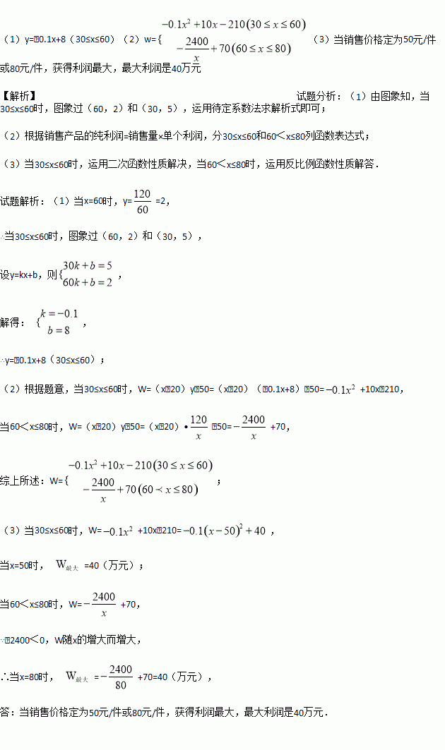 某工艺品厂生产一种汽车装饰品,每件生产成本为20元,销售价格在30元至80元之间(含30元和80元),销售过程中的管理、仓储、运输等各种费用(不含生产成本)总计50万元,其销售量y(万个)与销售价格(元/个)的函数关系如图所示.