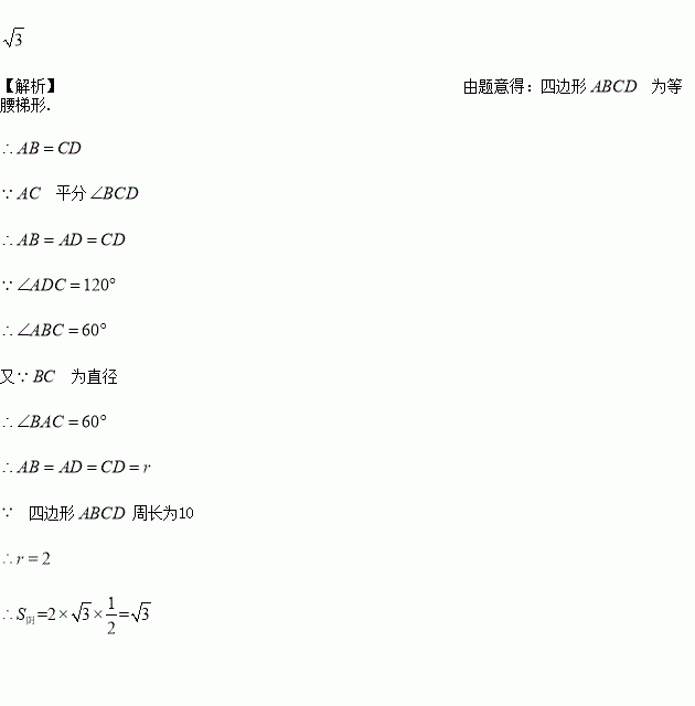 如图,已知点A、B、C、D均在以BC为直径的圆上,AD∥BC,AC平分∠BCD,∠ADC=120°,四边形ABCD的周长为10,则图中阴影部分的面积为__.