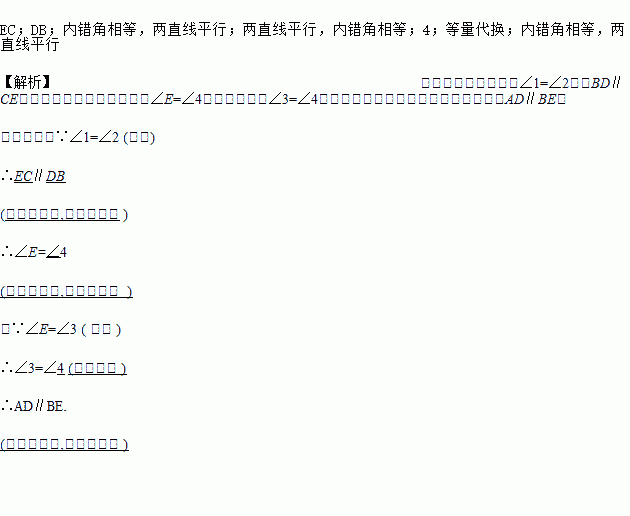 已知: 如图, ∠1=∠2, ∠3=∠E. 求证: AD∥BE
