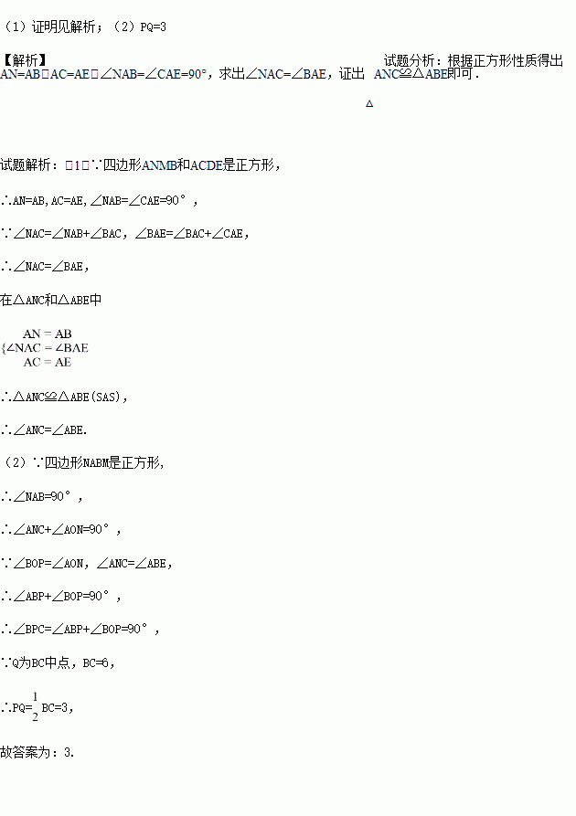 探究:如图,分别以△ABC的两边AB和AC为边向外作正方形ABMN和正方形ACDE,CN、BE交于点P. 求证:∠ANC = ∠ABE.