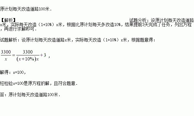 我区为缓解某景区的交通拥挤状况,区政府对通往景区的道路进行了改造.某施工队承包道路改造任务共3300米,为了减少施工对周边居民及交通的影响,施工队加快了速度,比原计划每天多改造10%,结果提前3天完成了任务,求原计划每天改造道路多少米?