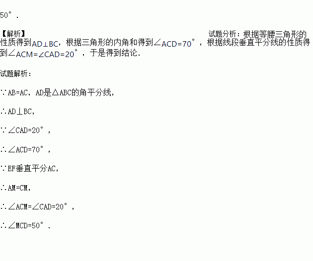 如图,已知△ABC,AB=AC,AD是△ABC的角平分线,EF垂直平分AC,分别交AC,AD,AB于点E,M,F.若∠CAD=20°,求∠MCD的度数.