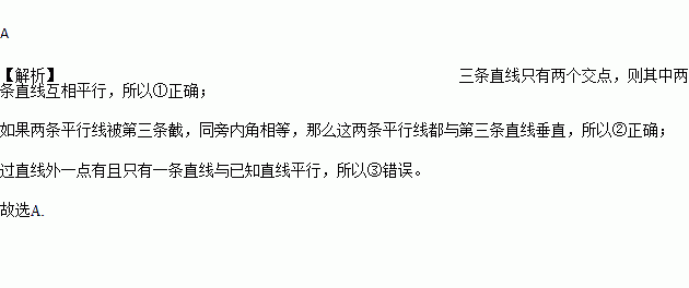 下列语句:①三条直线只有两个交点,则其中两条直线互相平行;②如果两条平行线被第三条截,同旁内角相等,那么这两条平行线都与第三条直线垂直;③过一点有且只有一条直线与已知直线平行,其中( )