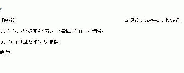 A. 6x+9y+3=3(2x+3y) B. x2+2x+1=(x+1)2 C. x2-2xy-y2=(x-y)2 D. x2+4=(x+2)2