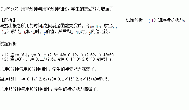(1)若用10分钟提出概念,学生的接受能力y的值是多少?(2)如果改用8分钟或15分钟来提出这一概念,那么与用10分钟相比,学生的接受能力是增强了还是减弱了?通过计算来回答.