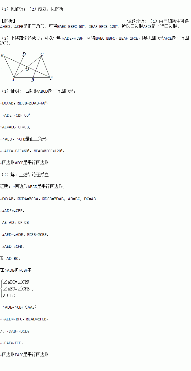 如图,在?ABCD中,∠DAB=60°,点E、F分别在CD、AB的延长线上,且AE=AD,CF=CB.