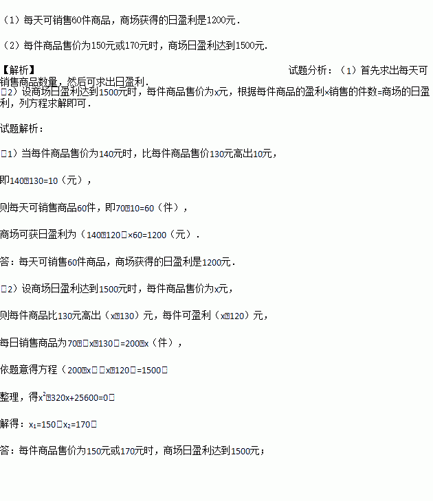 (1)当每件商品售价定为140元时,每天可销售多少件商品?商场获得的日盈利是多少?