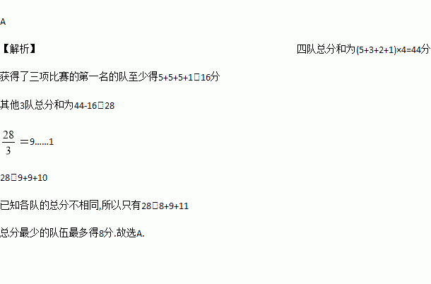 有4支队伍进行4项比赛,每项比赛的第一、第二、第三、第四名分别得到5、3、2、1分.每队的4项比赛得分之和算作总分,如果已知各队的总分不相同,并且其中一队获得了三项比赛的第一名,问总分最少的队伍最多得多少分?