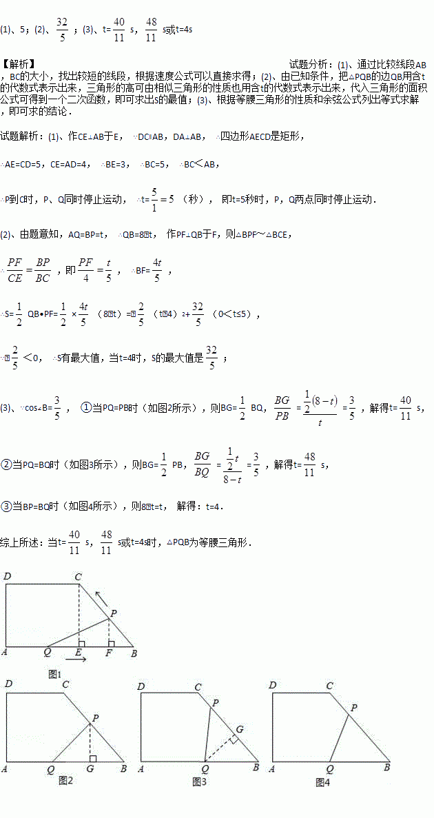 如图,在四边形ABCD中,DC∥AB,DA⊥AB,AD=4cm,DC=5cm,AB=8cm.如果点P由B点出发沿BC方向向点C匀速运动,同时点Q由A点出发沿AB方向向点B匀速运动,它们的速度均为1cm/s,当P点到达C点时,两点同时停止运动,连接PQ,设运动时间为t s,解答下列问题: